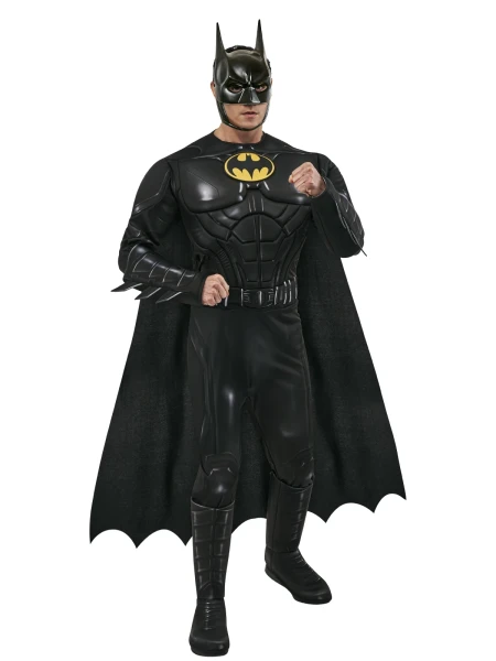 Includes Jumpsuit with digitally printed bodice, fibre filled muscles, full length sleeves with digital print and attached gauntlets Jumpsuit also features a digitally printed belt and the iconic yellow and black Bat logo at the chest Pants feature attached boot tops with elastic strap to go under shoes and digital print Detachable black cape with velcro tabs at shoulders Moulded 1/2 mask with elastic strap and velcro fasten This is an officially licensed DC Comics product
